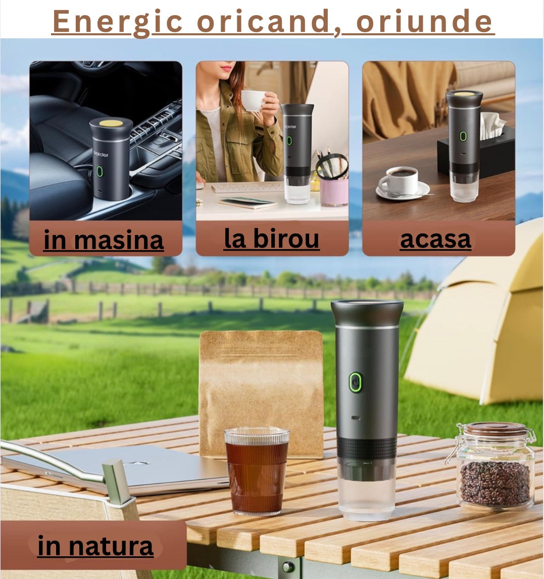 Espressorul portabil îți oferă libertatea de a prepara o cafea fresh oriunde: la birou, în mașină, în drumeții sau în vacanță. Este ușor, compact și extrem de simplu de folosit — tot ce ai nevoie este cafea măcinată sau capsule și puțină apă.